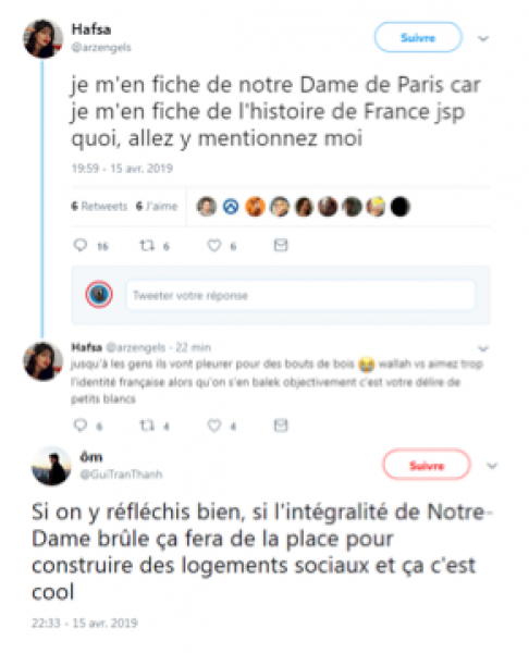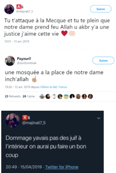 Ces propos ne concernent pas la majorité de nos compatriotes musulmans qui adhèrent à la république laïque et à la France, fille ainée de l’Église. Certaines grandes figures de la communauté musulmane prennent le contre-pied ce ces scandaleuses attitudes. Dalil Boubakeur, recteur de la Grande Mosquée de Paris, appelle les musulmans de France à contribuer à la souscription nationale pour la reconstruction de Notre-Dame, qu’il désigne comme un « temple de Dieu » et « joyau du patrimoine national », avant d’ajouter « qu’elle représente pour les musulmans, le symbole de Marie, “Meriem”, mère de Jésus, mentionnée à trente-quatre reprises dans le Coran ». Anouar Kbibech, président du Rassemblement des musulmans de France ou Mohammed Moussaoui, président de l’Union des mosquées de France, ont également lancé des appels à la prière ou à la charité. Mais force est néanmoins de déplorer que l’expression spontanée des musulmans de France, du moins sur les réseaux sociaux, n’est pas au diapason de ces déclarations.