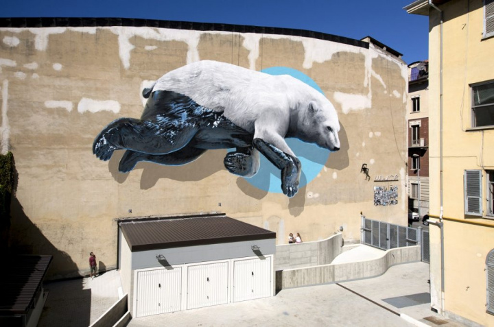Nevercrew à qui l’on doit cet ours à moitié mangé par les hydrocarbures est un duo suisse de deux artistes, Christian Rebecchi et Pablo Togni, qui travaillent ensemble depuis de nombreuses années. Ils sont tous deux diplômés de l’Ecole d’Art de Lugano et leur style est directement reconnaissable. Colorées, visuelles, directes, sans ambiguïté, leurs œuvres sont des coups de poing, des lames qui rentrent dans la peau, des piqures qui essaient de réveiller notre conscience face aux défis environnementaux et au comportement de l’homme. La pollution des hydrocarbures, les dangers que l’on fait courir aux animaux et aux mamifères marins en bouleversant leur mode de vie et leur environnement, qui provoquent leur extinction programmée, sont autant de thèmes déployés par ces deux artistes sur les murs de Grenoble, Turin, New Delhi… Les couleurs chatoyantes renforcent le côté percutant des messages et l’esthétisme léché a pour but de capter notre attention pour nous dire : « tu vois, tu sais maintenant », donc « tu es responsable ».