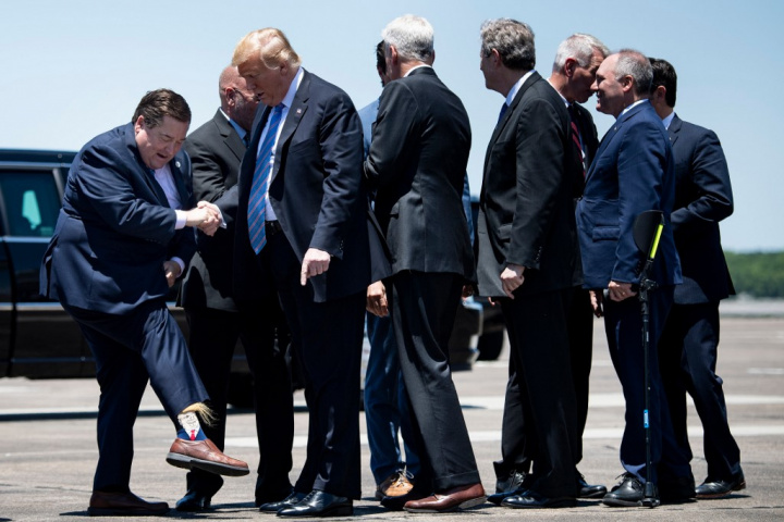 Le gouverneur de Louisiane, Billy Nungesser, accueillait le président américain le 14 mai à Lake Charles pour parler énergie et infrastructures. Sa fierté de lui montrer ses chaussettes à l’effigie de Donald Trump illustre la popularité de ce dernier aux Etats-Unis. Et ce ne sont pas les 22 candidats à l’investiture démocrate qui vont le faire pâlir…