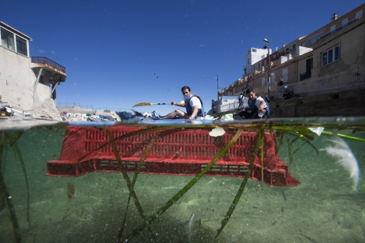 Des kayakistes tentent de collecter une boîte en plastique dans la mer le 30 mai 2019 lors du « Grand Défi », le premier concours de collecte de déchets en mer à Marseille. 100 compétiteurs ont ramassé 1,3 tonnes de déchets en une journée. Avec la participation de Frédéric Bousquet, Fabien Gilot, Muriel Hurtis, des acteurs de Plus Belle la Vie, des basketteurs du club de Fos pour cette première compétition de ramassage de déchets couplée à une chasse au trésor.