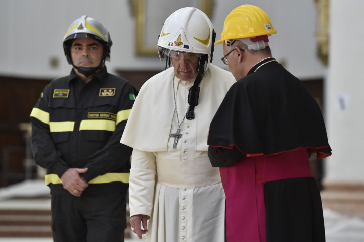 Le Pape François (C) portait un casque de sécurité lors de la visite de la cathédrale de Camerino dans les zones touchées par le séisme du diocèse de Camerino dans cette petite ville des Marches.
