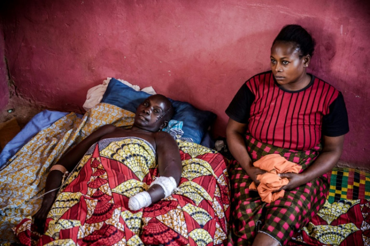 Des balles se sont logées dans chacune de ses jambes. Son crâne rasé est traversé d’une immense balafre tandis qu’un bandage grossier recouvre son poignet gauche. Les hommes qui l’ont attaquée lui ont tranché la main à la machette.