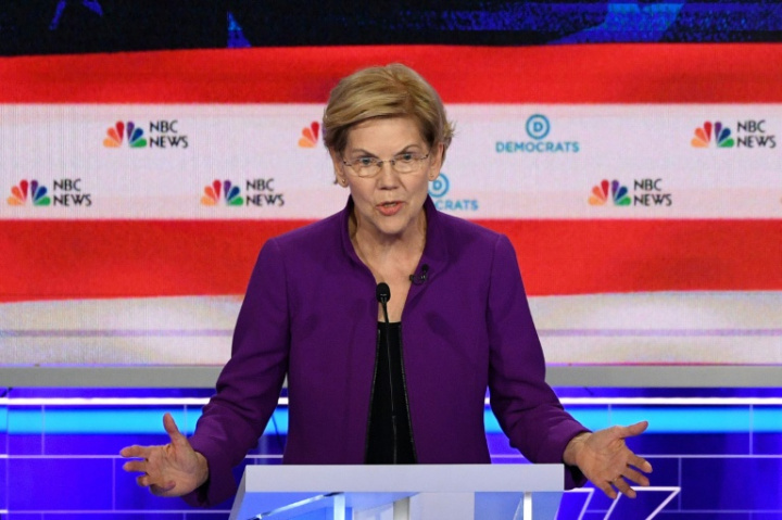 La candidate à l’investiture démocrate Elizabeth Warren sur le plateau du premier débat pour la présidentielle de 2020 à Miami, en Floride, le 26 juin 2019 – AFP / JIM WATSON