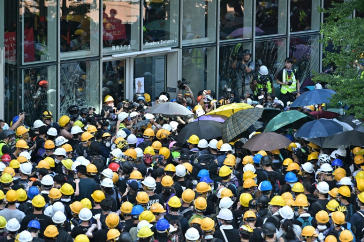 Des manifestants tentent d’entrer dans le Parlement, le 1er juillet 2019 à Hong Kong – AFP / Anthony WALLACE