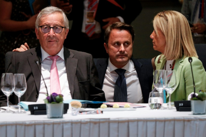 Le président de la Commission européenne Jean-Claude Juncker (G) et le Premier ministre du Luxembourg Xavier Bettel (C) participent à un dîner de travail durant un sommet européen, à Bruxelles le 30 juin 2019 – POOL/AFP / GEOFFROY VAN DER HASSELT