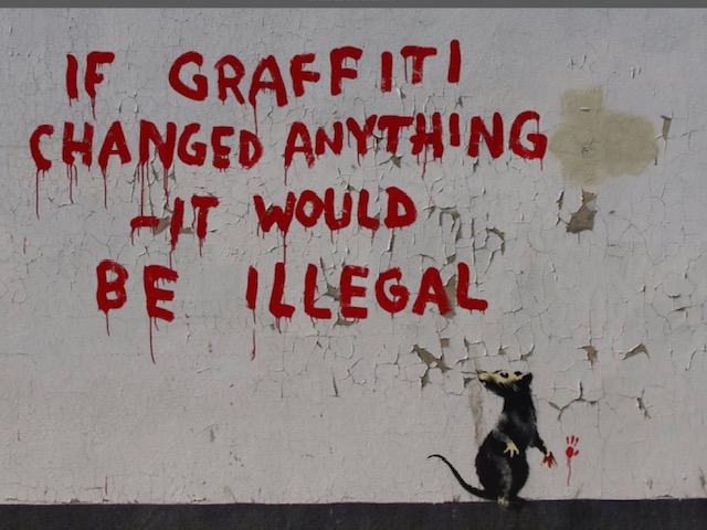 L’éruption du tag « vient du hurlement de ceux qui n’existent pas » dit Codex Urbanus. Le street rat ne porte initialement, et encore souvent, pas d’autre message que « je suis là », « j’existe » ou « je suis toujours là ». C’était bien le sens des inscriptions de Taki 183. Et les street ratistes ont pullulé, en écho à une société qui écrase et rejette ce qui ne rentre pas dans l’imagerie de la réussite, qui donne moins sa chance qu’elle ne le proclame. Brisant le mur du silence en faisant du bruit sur les murs. Tellement de bruit que la société adore désormais certains de ses plus gros street ratistes, dans une course à l’échalote médiatique et financière où l’on se demande qui l’emporte. Le rat doit-il devenir célèbre pour que son message porte ou la célébrité a-t-elle muté le rat en gros matou docile, qui de temps à autres se souvient qu’il a été rat et se refait un petit flip nocturne hors caméra ?
