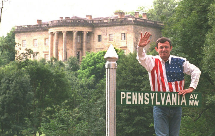 Alain Trampoglieri, nouveau propriétaire du château de Rastignac, près de Brive, pose le 03 juillet près du panneau de la Pennsylvania Avenue qu’il vient de fixer au pied de la réplique de la Maison blanche à la veille de l’Independance Day, fête nationale américaine célébrée le 04 juillet. Le château va devenir un musée franco-américain.