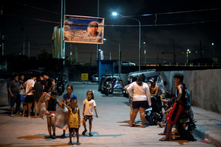 Des Philippins sous le portrait à la mémoire de Bryan Conje, retrouvé mort le 5 juillet sous le pont où il vivait, le 7 juillet 2019 à Manille – AFP / Noel CELIS