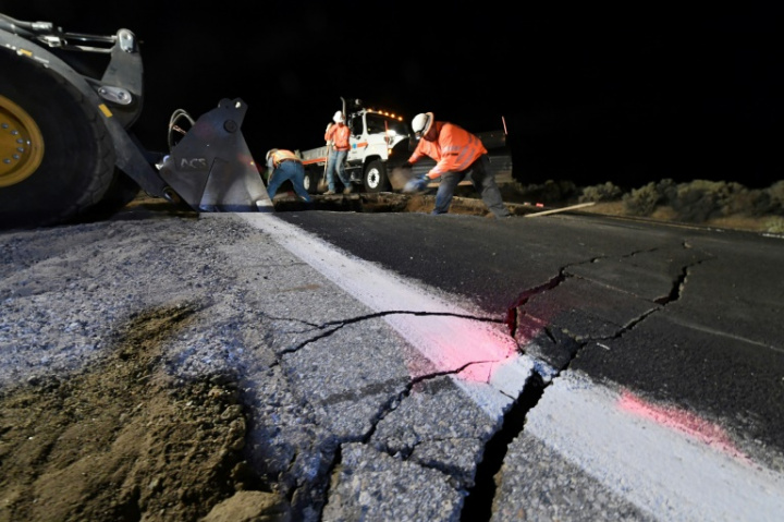 Des ouvriers comblent un trou ouvert sur une route près de Ridgecrest n Californie, après un séisme de magnitude 7,1, le plus important depuis 20 ans – AFP / Robyn Beck