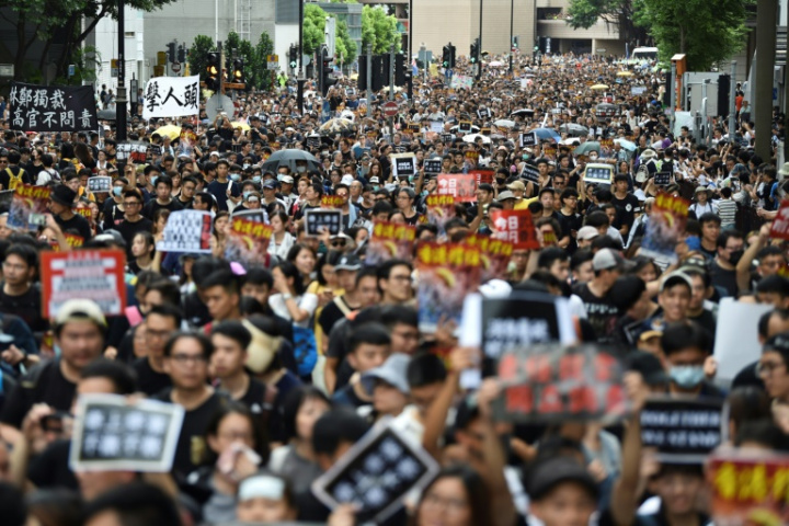 Des manifestants participent à une marche vers la gare de West Kowloon, le 7 juillet 2019 à Hong Kong – AFP / Hector RETAMAL