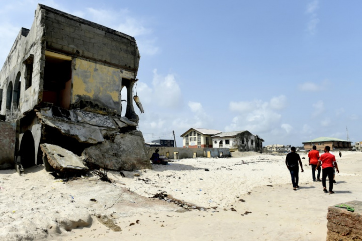 Des gens passent sur la plage d’Alpha Beach devant une maison détruite par l’érosion, le 29 avril 2019 – AFP / PIUS UTOMI EKPEI