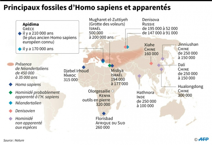 Principaux fossiles d’Homo sapiens et espèces apparentées – AFP / Valentina BRESCHI