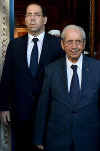 Le président du Parlement tunisien Mohamed Ennaceur (D) après avoir été intronisé président par intérim, avec le Premier ministre Youssef Chahed (G), à Tunis, le 25 juillet 2019