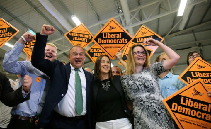 La candidate libérale-démocrate Jane Dodds (au centre) célèbre sa victoire à l’élection partielle de Brecon et Radnorshire, au Pays de Galles, le 2 août 2019 – AFP / Isabel INFANTES
