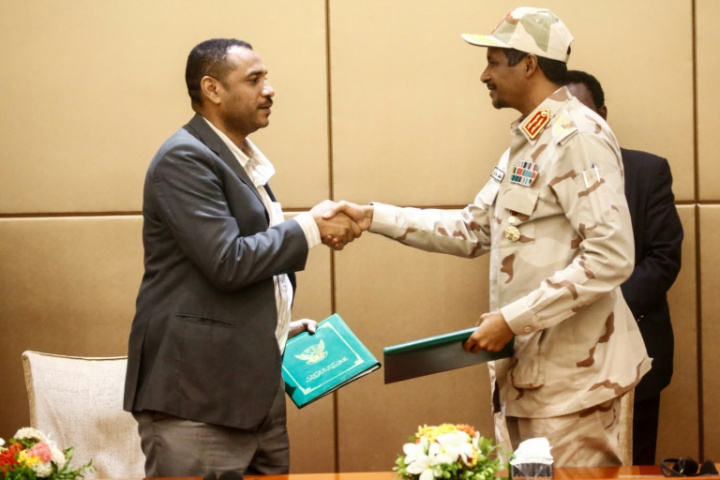 Le numéro deux du Conseil militaire au pouvoir au Soudan Mohammed Hamdane Daglo (droite) et le leader de la contestation Ahmed Rabie se serrent la main après avoir signé la déclaration constitutionnelle actant la création d’un pouvoir civil, le 4 août 2019 à Khartoum – AFP / ASHRAF SHAZLY