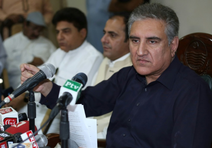Le ministre pakistanais des Affaires étrangères Shah Mehmood Qureshi (D) participe à une conférence de presse, le 7 avril 2019 à Multan, dans le centre du Pakistan – AFP/Archives / SS MIRZA