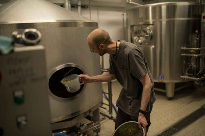 Le frère Mateusz surveille la fabrication de la bière artisanale dans l’abbaye du Mont-saint-Bernard, le 17 juillet 2019 – AFP / OLI SCARFF