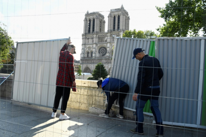 Des ouvriers installent des palissades le 13 août 2019, près de Notre-Dame de Paris en vue de la décontamination des rues alentour de la cathédrale – AFP / BERTRAND GUAY