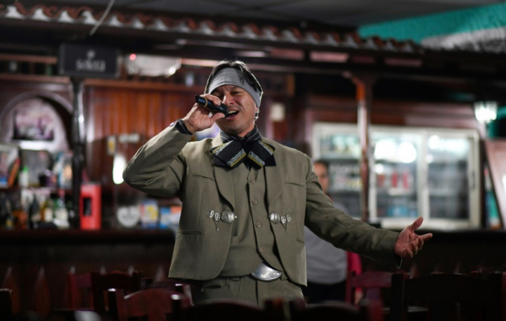 L’infirmier vénézuélien Edgar Fernandez, en costume de mariachi, chante dans un bar-restaurant d’El Junquito, près de Caracas, le 24 août 2019 – AFP / Federico PARRA