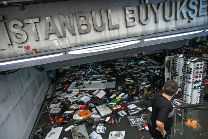 Un commerçant tente de sauver sa marchandise dans un centre commercial du quartier d’Eminonu à Istanbul, le 17 août 2019. – AFP / Ozan KOSE