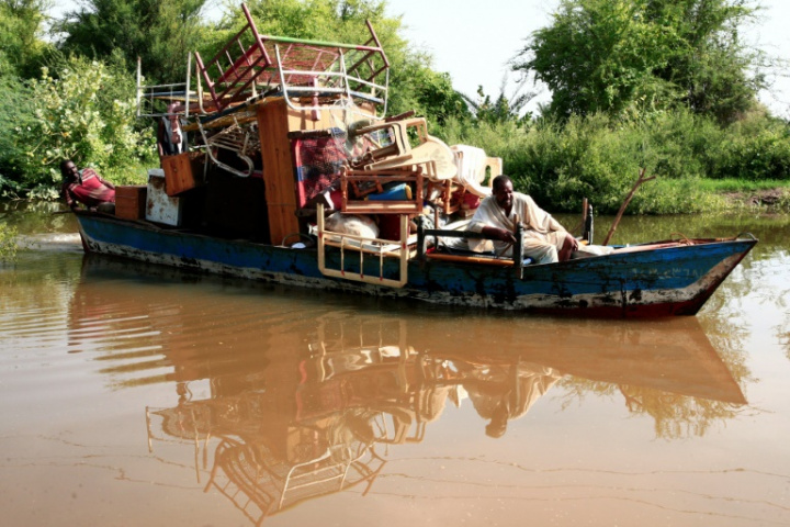 Des Soudanais transportent leurs biens sur un bateau après des inondations dans le village de Wad Ramli, sur les rives du Nil, au nord de la capitale Khartoum, le 26 août 2019 – AFP / Ebrahim HAMID