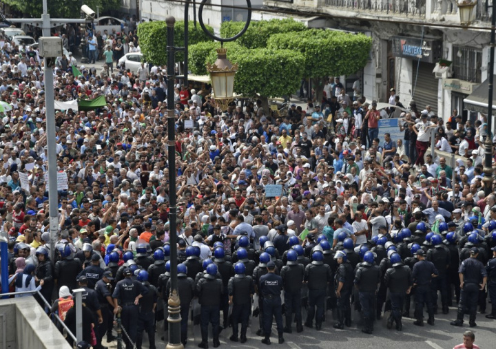 Les forces de sécurité algériennes forment une barrière humaine devant les manifestants prenant part à un rassemblement dans les rues de la capitale à Alger le 17 septembre 2019, au lendemain de la convocation de l’élection présidentielle le 12 décembre par le président par intérim Abdelkader Bensalah. Le 20 septembre, les manifestations s’annoncent massives…