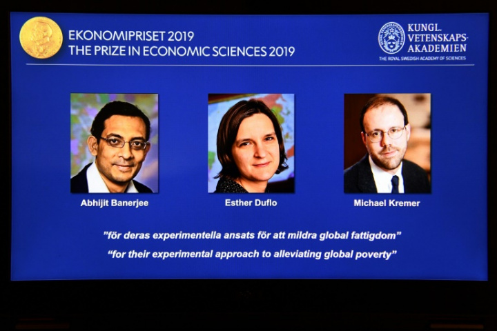 Capture d’écran montrant les trois lauréats du Nobel d’économie 2019, Esther Duflo, Abhijit Banerjee et Michael Kremer, à Stockholm (Suède) le 14 octobre 2019. – AFP / Jonathan NACKSTRAND