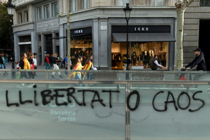 Des jeunes drapés dans des drapeaux catalans passent devant un graffiti « Liberté ou Chaos » après une nouvelle nuit de violences, le 18 octobre 2019 à Barcelone – AFP / Josep LAGO