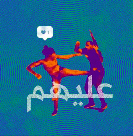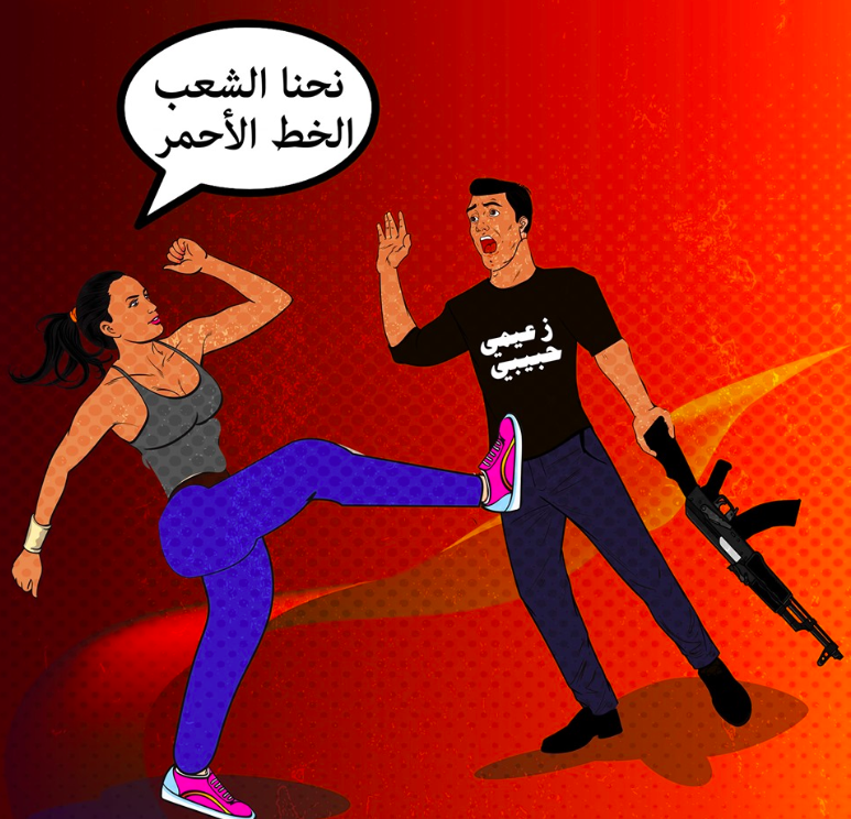 L’image d’une femme donnant un coup de pied à un membre de l’équipe de sécurité d’un politicien circule amplement sur les réseaux sociaux : c’est aussi le soulèvement des femmes. En arabe : عليهم د veut dire : « Sur eux »