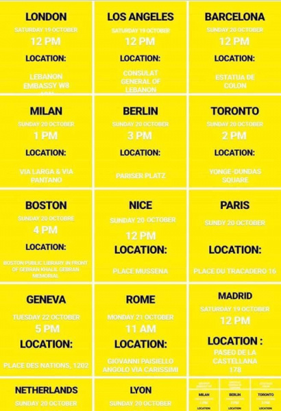 11h40 : des appels à manifester dans toutes les diasporas libanaises se multiplient. Après Paris (cf. notre info de 10h30), appel à rassemblement à Bruxelles et Londres pour dimanche 19 octobre.
