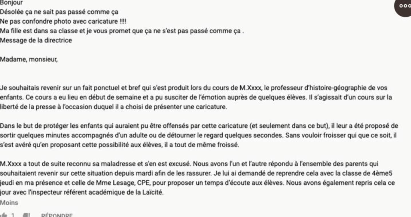Relayant une version largement démentie par de nombreux parents d’élèves, comme en témoigne ce mail d’un autre parent, le parent accusateur dans sa vidéo montre son mépris des valeurs de la République et la supériorité qu’il accorde aux préceptes de l’Islam, quand bien même ceux-ci contreviendraient aux lois de la République française (droit contre interdiction de représenter le prophète Mohammed, égalité contre inégalité des femmes et des hommes…).