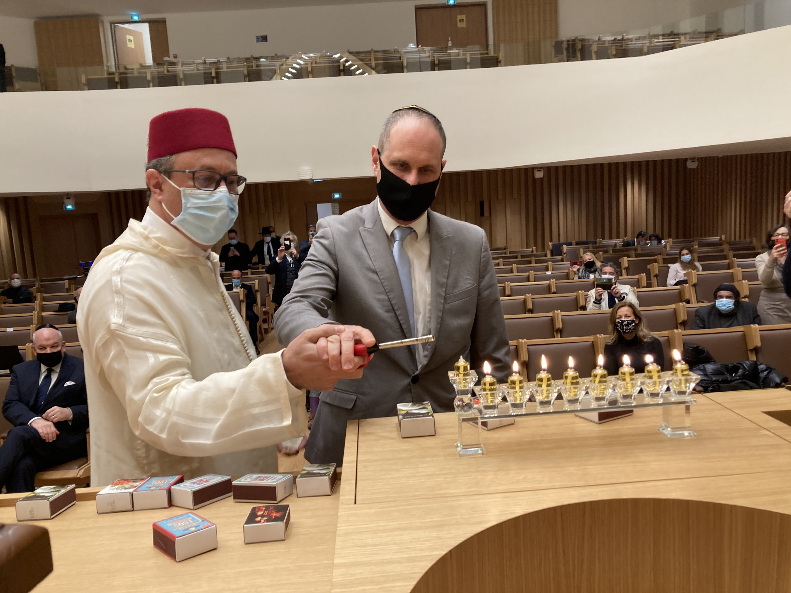 De même, ces jours-ci, en France, deux représentants d’Israël et du Maroc, dont, côté marocain, Monsieur Saad Bendourou, chef de Mission adjoint, au nom de Son Excellence Chakib Benmoussa, Ambassadeur du Sa Majesté le Roi du Maroc en France, ont allumé la huitième bougie de Hannouka, la fête des Lumières, et en quelques sortes le Noël des Juifs. La cérémonie s’est déroulée dans le magnifique Centre Européen du Judaïsme à Paris, à l’invitation de Joël Mergui, président du Consistoire central des communautés juives de Paris, lui-même né à Meknès au Maroc.
