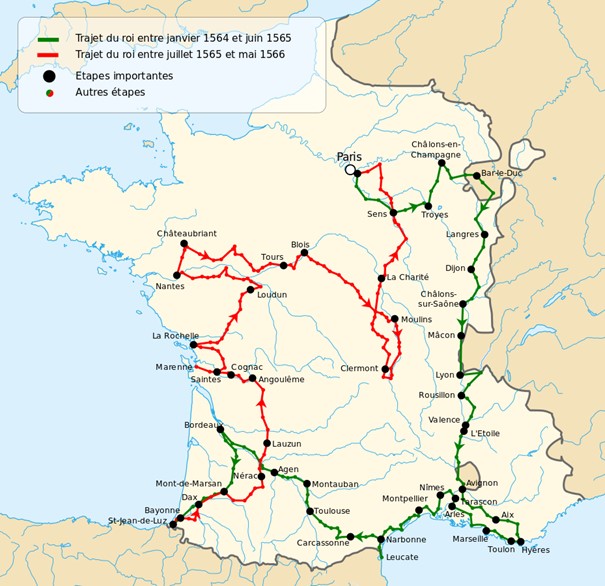 Dans le « style poncif », Michelet doit recevoir la palme. Si ! Car Charles IX est résumé dans l’Histoire officielle au massacre de la Saint Barthélémy (1572). Tout le monde sait aujourd’hui qu’en frappant ainsi, l’Italienne Catherine de Médicis voulait frapper par rebonds le pape et le roi d’Espagne, et démontrer que la France demeurait – ce qui était tout sauf évident – catholique. Charles IX n’aimait ni la Cour ni Paris. On l’a souvent résumé à un chasseur, qui ainsi fuyait sa mère, et recherchait la compagnie de son ami, un certain amiral de Coligny, un des maîtres de la communauté protestante… Que l’on observe juste un instant la carte ci-dessous :