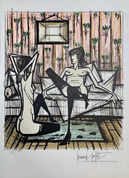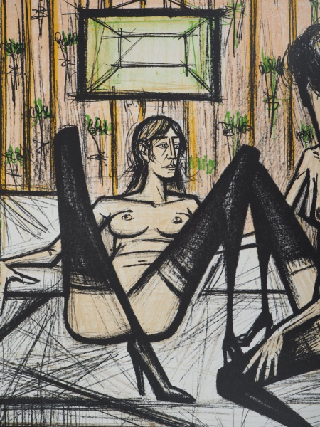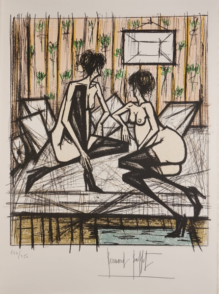 Le lit, pour lui, n’est pas un espace de quiétude. D’ailleurs, l’enfant Bernard dort très mal. Le lit sera un lieu d’interrogation, de tourment, d’électricité. Quitte à devenir fortement sexualisé. Marié à la chanteuse Annabelle, née Schwob de Lure (1928-2005) -aux deux parents suicidés-, il intègre son monde, celui des figures de Saint-Trop des années soixante et des quartiers « in » de Paris, avec les mœurs qui s’y rattachent. La dolce vita n’a rien de doux. Et les thèmes, les traits, les coups de pinceau du peintre rendent compte de cette vérité qui s’impose : Annabelle et lui, frappés d’un coup de foudre, abandonnant leurs liaisons (lui, en 1958, avec Pierre Bergé) jusqu’alors affichées, traverseront la vie comme deux êtres trop exposés, trop écorchés, et résolument… distincts. Bien qu’Annabelle ait pu écrire après que Buffet ait rejoint -volontairement – l’au-delà : « La vérité est que je ne sais pas vivre sans toi, alors je fais semblant d’être. » Ensemble, ils avaient descendu la route de l’alcool, mondain ou pas, et ensemble ils l’avaient remonté. Ils avaient pas mal déménagé. On peut se demander d’ailleurs si Bernard Buffet, dont les œuvres sont parcourues d’angles, qui rejetait l’impressionnisme et surtout l’abstraction, bref la « peinture dominante » et se réclamait de Géricault (1791-1824) et Courbet (1819-1877), ne sera pas – par-delà son immense succès sa vie durant et son entrée à l’Académie des Beaux-Arts- un jour reconnu pour ce qu’il est : un homme qui recherchait, par-delà la composition très classique de ses sujets, l’exposition des tensions extrêmes qui animent une peinture, et pour finir l’harmonie de ses toiles – un être humain qui recherchait pouvoir simplement, un jour, dormir en paix.