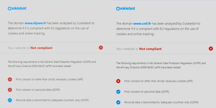 En effet, nous avons eu la curiosité de soumettre ces deux sites publics emblématiques, l’Élysée et la CNIL, gardienne donc du respect du RGPD, aux services de prestataires les plus connus en matière d’évaluation de la conformité : Cookiebot ou Usercentrics. Le résultat de l’analyse est sans appel : « site not compliant ». Le résultat est édifiant !
