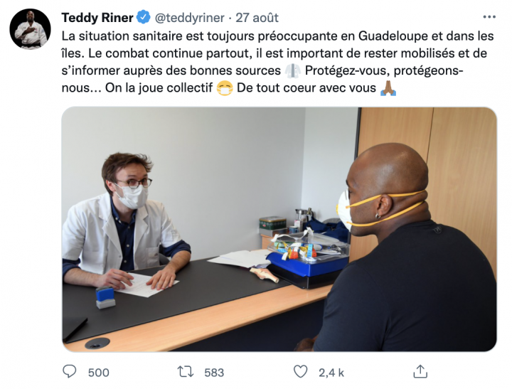 Eh bien non, sur RTL le 14 septembre, Teddy Riner a refusé de s’engager explicitement pour la vaccination ou pour soutenir les soignants qui appellent les Antillais à le faire (contrairement à la footballeuse Wendy Renard notamment), arguant de la liberté de chacun de choisir.