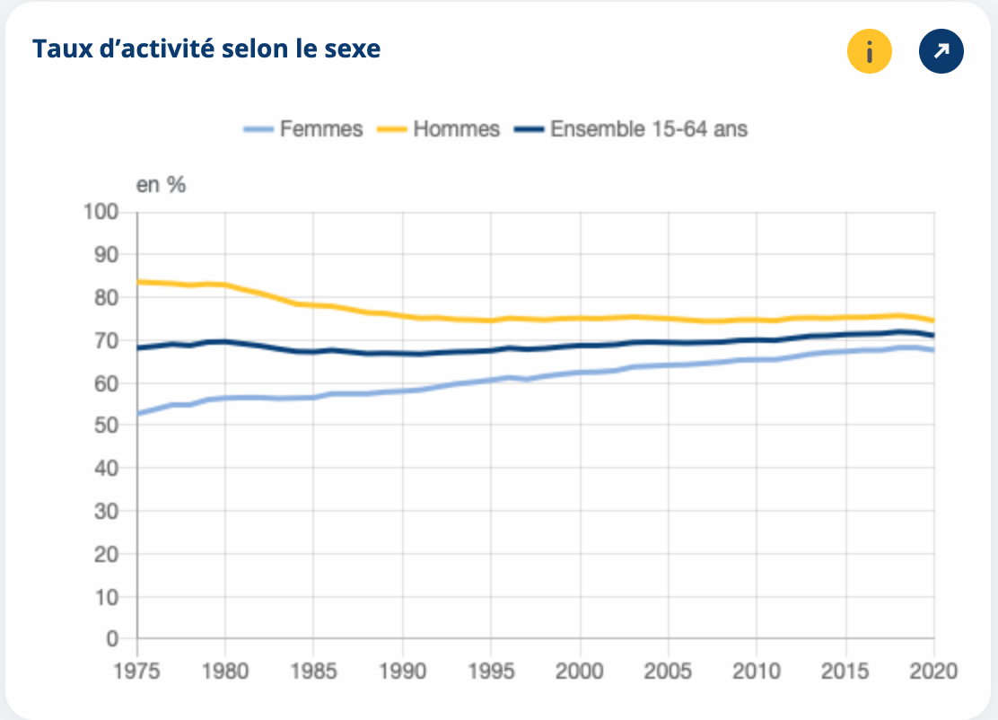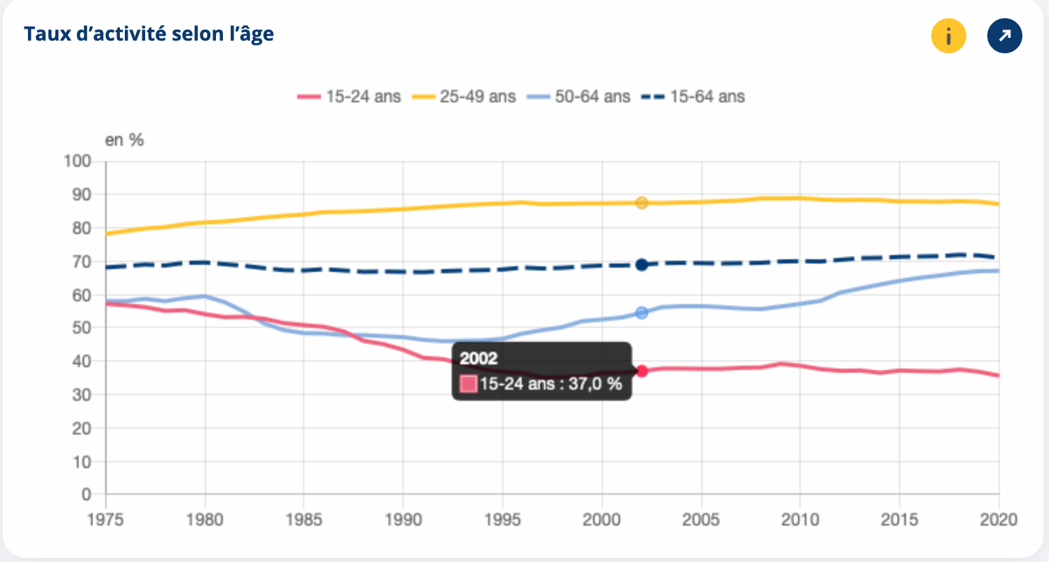 En France, en 2020, à peine 71 % des personnes entre 15 et 64 ans sont actives, c’est-à-dire en emploi ou au chômage, très loin des taux des autres grands pays. Certes, ces 40 dernières années, le taux d’activité des femmes a largement progressé, heureusement, mais, dans le même temps, celui des hommes a baissé fortement, passant de 83 % à 74 %. Si nous regardons les évolutions par classe d’âge, on voit très nettement que les personnes de 50 ans à 64 ans ont connu une nette amélioration de ce taux d’activité. Les efforts successifs des gouvernements de Jacques Chirac, Jospin inclus, puis de Nicolas Sarkozy ont permis d’améliorer l’employabilité des « seniors », mais cela stagne sous Hollande et Macron. Ce taux n’est d’ailleurs que de 67 %, pas très flatteur comme bilan.