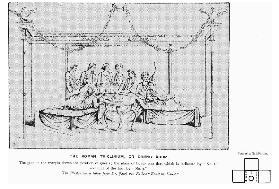Mais s’il faut rendre à César ce qui est à César, le contraire est également vrai. Ici, il s’agit plutôt de lui prendre ou reprendre (le triclinium). Ce sont en effet les Étrusques, habitants de l’Italie pré-romaine, qui semblent avoir été précurseurs en la matière.