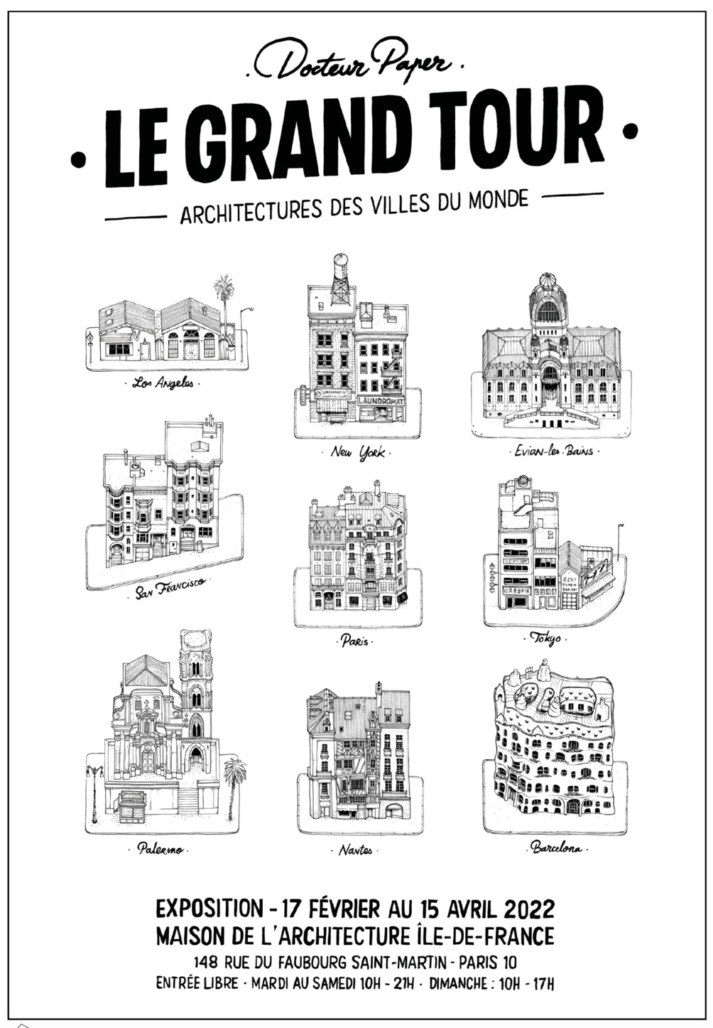 Le Grand Tour est une sélection des œuvres de l’illustrateur nantais Docteur Paper : l’événement porte un regard patrimonial sur la série Travel With Me dont l’artiste célèbre les 10 ans cette année. Un tour de l’architecture des villes du monde capturées au cours de ses voyages, que l’exposition accompagne du récit qui a façonné l’évolution de ces villes. De la petite à la grande ville, de l’art roman au style international… Quels sont les marqueurs architecturaux qui composent nos villes ? Comment l’histoire nous les a-t-elle légués ? Que retient-on de nos déplacements ? Qu’est-ce qui fonde l’imaginaire d’une cité ? Autant de questions qui peuvent trouver un début de réponse dans les réalisations de Jérôme Baillet, allias Docteur Paper. Jérôme Baillet s’est construit patiemment, guidé par la passion du dessin qui l’anime. Durant ses premières années, il découvre, expérimente, apprend. De l’esquisse à la peinture, du collage à la création de mobiliers, l’artiste tâtonne, cherche un style qui le caractérisera et lui permettra de s’exprimer. Très tôt, il choisit d’animer le papier, dessinant sans relâche et découpant au scalpel des feuilles qui deviendront ses premiers Paper toy. Une technique proche de l’origami, un outil et un goût pour le travail chirurgical qui lui donneront son nom de scène : Docteur Paper. Infatigable globetrotteur, l’illustrateur dessine au feutre, d’un trait précis, les items des villes qu’il déniche. Architecture, trame urbaine, véhicules, ouvrages d’art ou encore enseignes publicitaires marquent la mémoire de ses voyages et participent à livrer une vision patrimoniale de la ville. Au-delà de l’œuvre, c’est un instantané qu’il nous fait découvrir, une histoire qu’il nous raconte. Du dôme géodésique de la Biosphère à Montréal aux rues étroites du vieux Paris, de la célèbre « Chaussure de ski » de l’architecte Christian de Portzamparc à Lille à la vie trépidante du centre d’Osaka… Plus qu’une invitation au voyage, les dessins en noir et blanc et le sens du détail de l’artiste plaident pour une pédagogie architecturale.