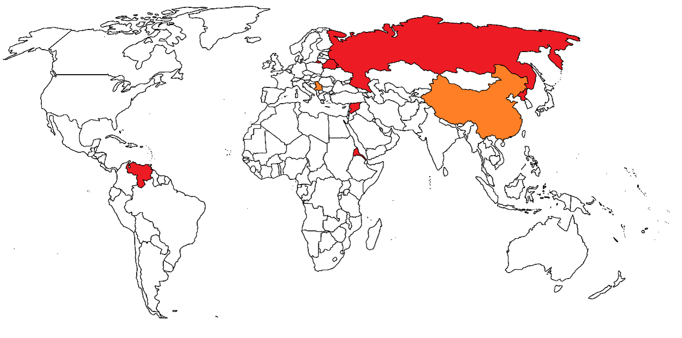 Carte des soutiens explicits au Kremlin (en rouge) lors de l’Assemblée générale de l’ONU du 2 mars et des pays dont les actes prouvent une solidarité formelle avec la Russie (en orange).
