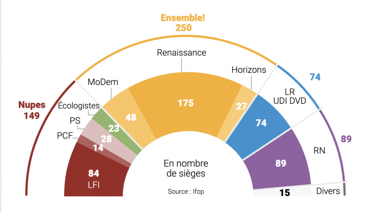 Au fond, avec les députés des Insoumis et du Rassemblement National qui, eux, ne voteront évidemment pas de projets de loi majeurs, ces deux groupes ne représentent que 173 députés dans l’hémicycle, deux députés de moins que le groupe Renaissance.