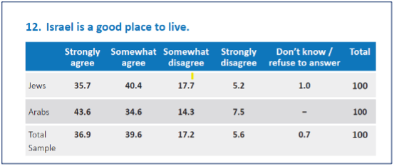 A l’encontre des idées véhiculées, lorsque l’on demande aux Arabes Israéliens s’il est agréable de vivre en Israël, les ¾ d’entre eux répondent positivement et l’on ne trouve pas vraiment de différences dans leur jugement par rapport à la population juive :
