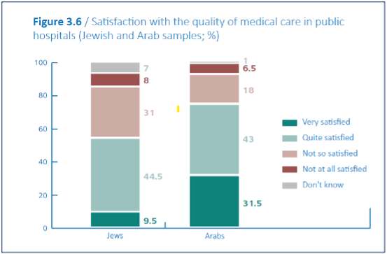 Là encore, l’appréciation des Arabes est plus favorable que celle de la population juive, avec environ 75% qui considèrent la qualité des soins médicaux satisfaisants contre 55% pour la population juive.
