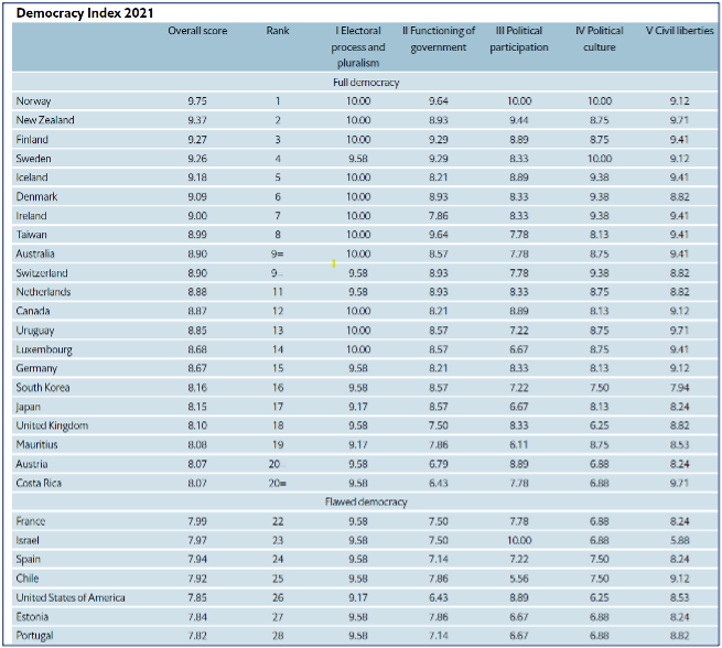 L’édition 2021 du rapport « Democracy Index » produit par l’Economist Intelligence Unit classe Israël au 23ème rang sur 167 pays étudiés, juste derrière la France et la Grande-Bretagne et devant l’Espagne, le Portugal, l’Italie et les Etats-Unis.