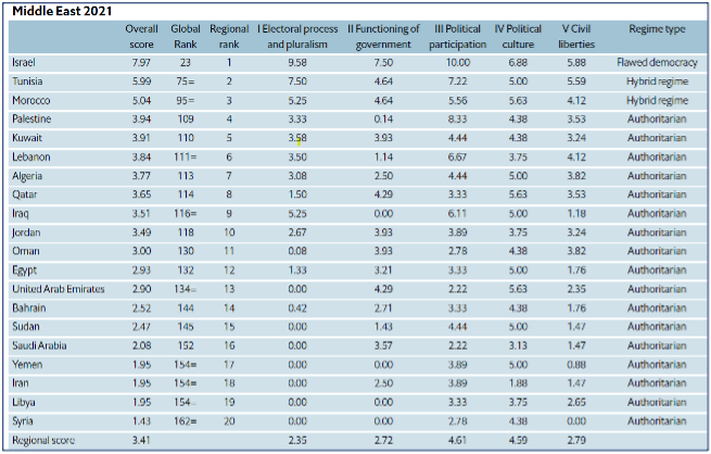 Plus intéressant encore est de voir comment se situe Israël parmi les autres pays du Moyen-Orient… Israël est le seul pays démocratique de toute la région, loin devant la Palestine classée 109ème sur 167 dans la catégorie des régimes autoritaires !