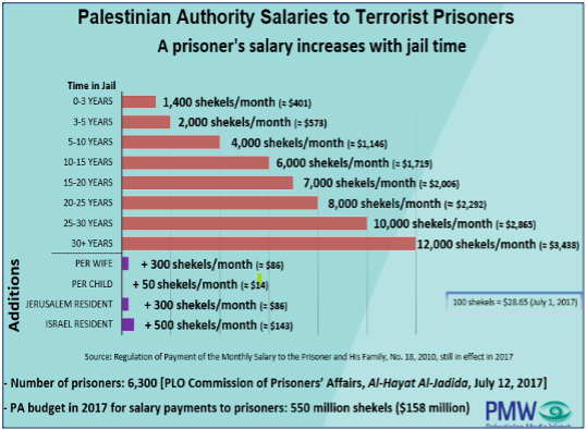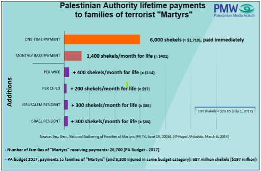 L’autorité Palestinienne soutient non seulement le terrorisme vis-à-vis d’Israël mais depuis 2003 récompense tous les terroristes ainsi que leurs familles en leur attribuant des allocations mensuelles à vie.