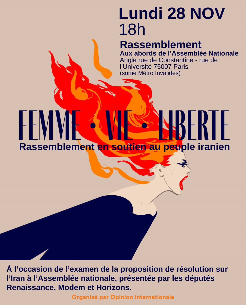 C’est pourquoi lundi 28 novembre à 18h pile, à l’initiative d’Opinion Internationale (qui anime la rubrique « IRAN, c’est une révolution ! ») et de femmes franco-iraniennes, en toute indépendance et en refusant toute tentative de récupération politique, syndicale ou autre, nous vous donnons rendez-vous aux abords de l’Assemblée Nationale pour soutenir le vote de cette résolution et, avec les députés qui voteront ce texte, dire aux Iraniens : « nous sommes avec vous ! ».