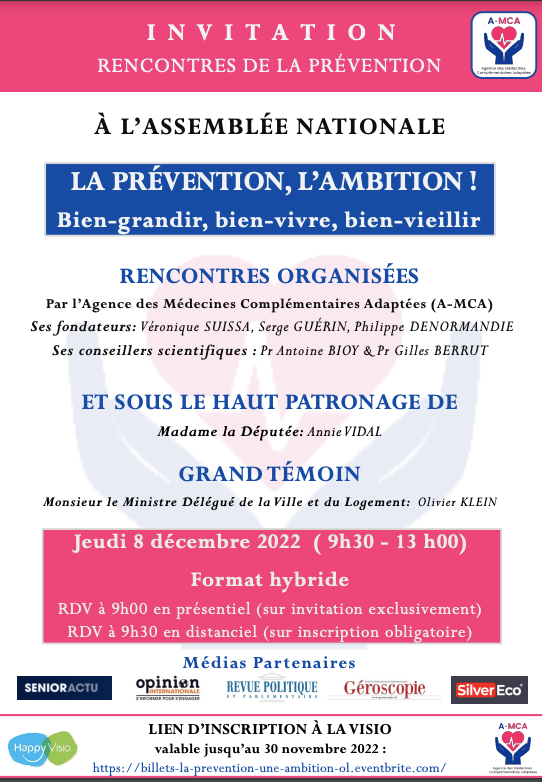 Face aux enjeux, l’Association Agence des Médecines Complémentaires Adaptées (A-MCA), sous le patronage de Madame la Députée Annie Vidal qui nous a accordé un entretien, organise une matinée de débat et de partage d’expériences sur la prévention tout au long de la vie.