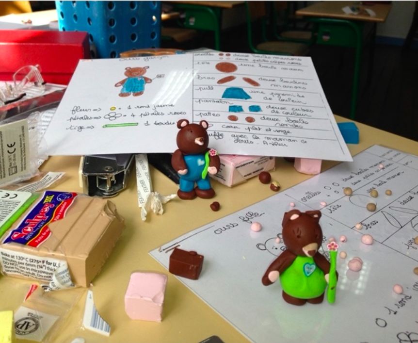Puis, j’ai confectionné des kits créatifs afin d’animer des ateliers, adaptés aux différents âges : pour les plus petits, des cartes à plat à colorier et à compléter avec une pâte-à-modeler qui sèche à l’air libre afin de donner du relief au dessin de Vinsours et de Noursonne ; pour les plus grands, un kit de création par l’enfant de son propre ours en pâte-à-modeler en 3D.