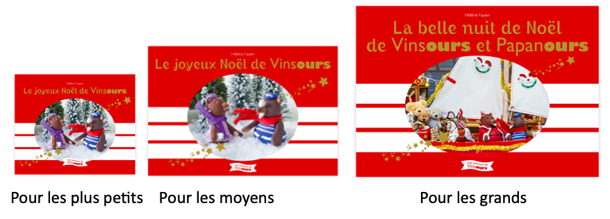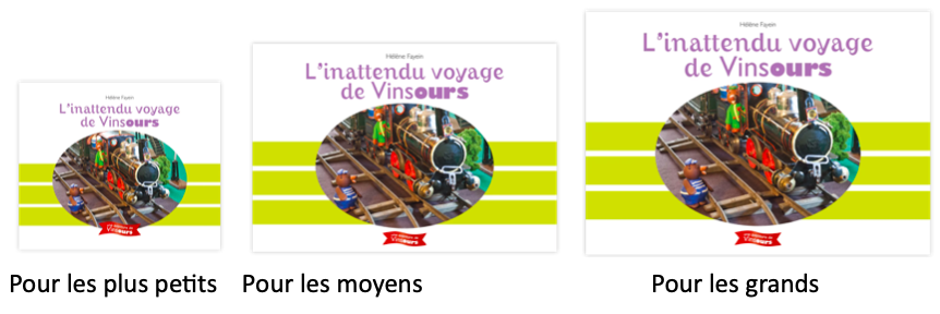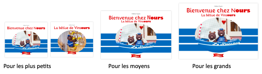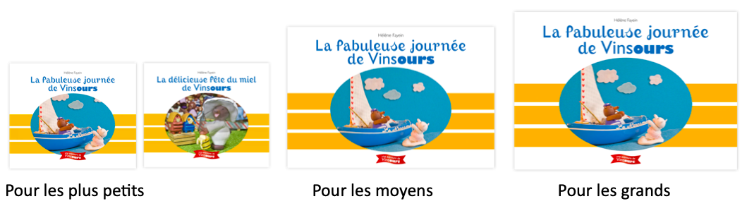 Durant les années passées à rencontrer les enfants de la petite section de maternelle au CM2, j’ai réalisé la nécessité d’adapter le niveau de la lecture des aventures de Vinsours aux différentes tranches d’âge. J’ai décidé de décliner trois formats, un grand pour les enfants de plus de 6 ans, un moyen pour les 3-6 ans et un petit pour les 0-3 ans. Les textes sont adaptés pour chaque niveaux de lecture et les illustrations sont parfois différentes.